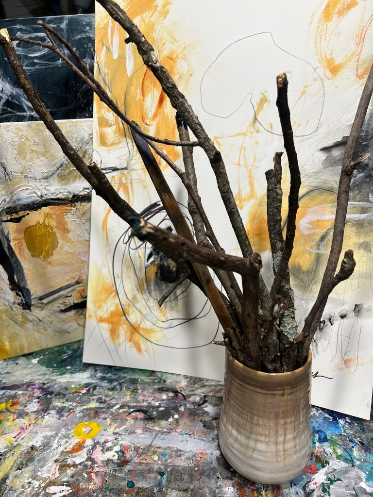 I have heard many artists tell me their inspiration for their paintings are from nature, trees, landscapes, and the outdoors. I have never been an outdoors person and while nature is beautiful to me, it just does not inspire my abstract paintings. BUT, I love using nature to make my tools to use IN my artwork!!! I make the most incredible paint brushes from branches I find!!!